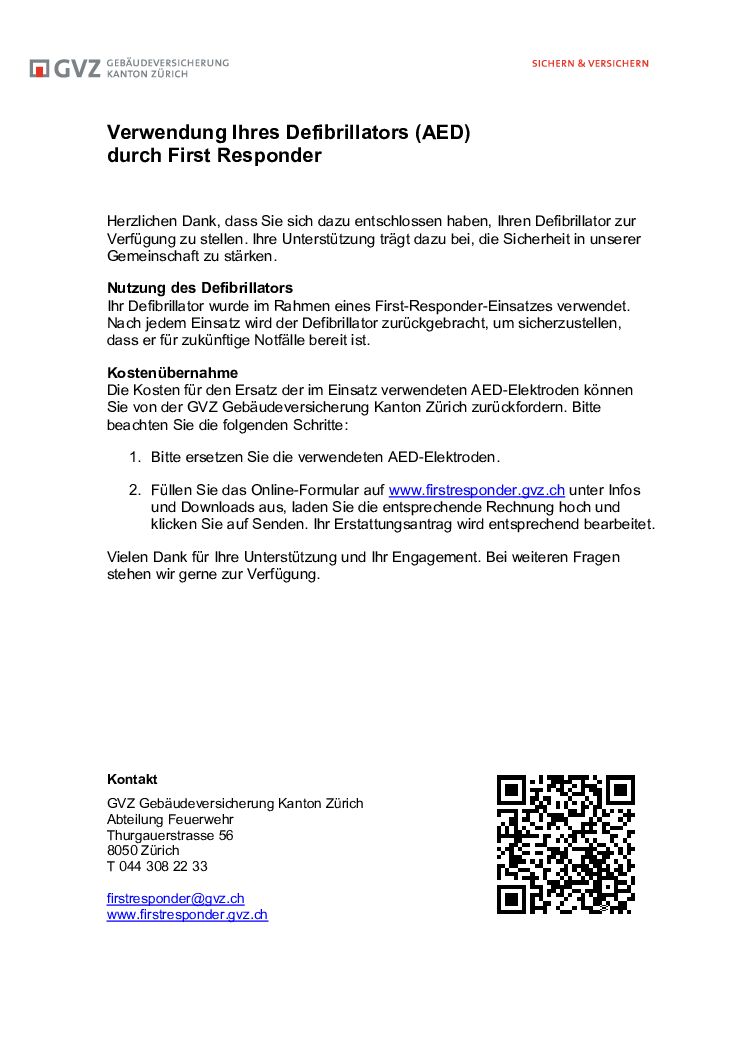 Ihr Defibrillator wurde im Rahmen eines First-Responder-Einsatzes verwendet. Die Kosten für den Ersatz der AED-Elektroden, die während eines Einsatzes verwendet wurden, können Sie bei der GVZ Gebäudeversicherung Kanton Zürich zurückfordern.